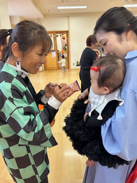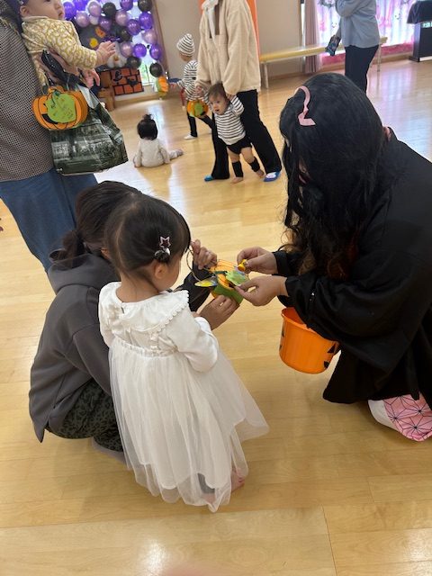 子育てひろば全体にハロウィンの装飾が施され、写真撮影やねんねアートのフォトスポットでは、パパやママが楽しそうにスマホ片手に可愛いお子さんの写真を撮っていました。