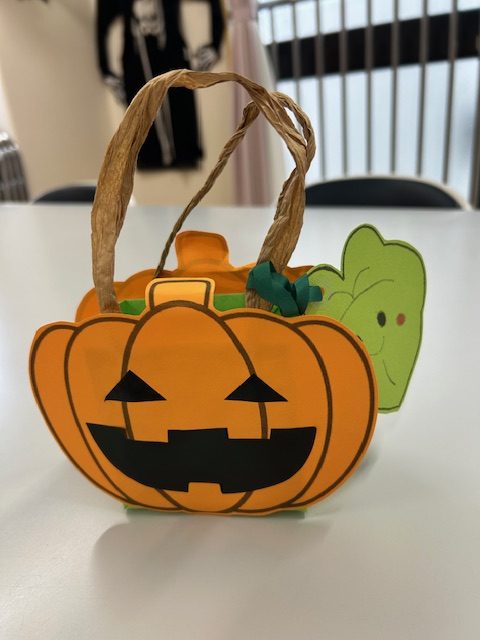 かぼちゃバッグに目と口のシールを付けてハロウィン・かぼちゃバッグの完成です。