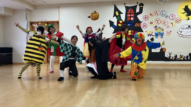 今年のスタッフダンスチームの仮装は【赤ずきんちゃん・白雪姫・プレゼントボックス・ピエロ・鬼滅の刃(炭治郎・穪豆子)みつばち】