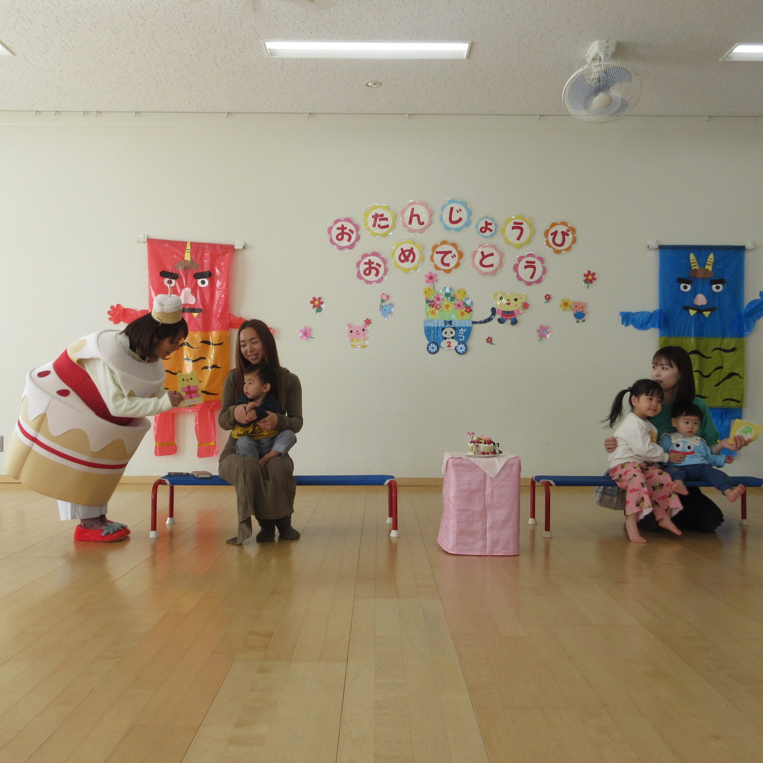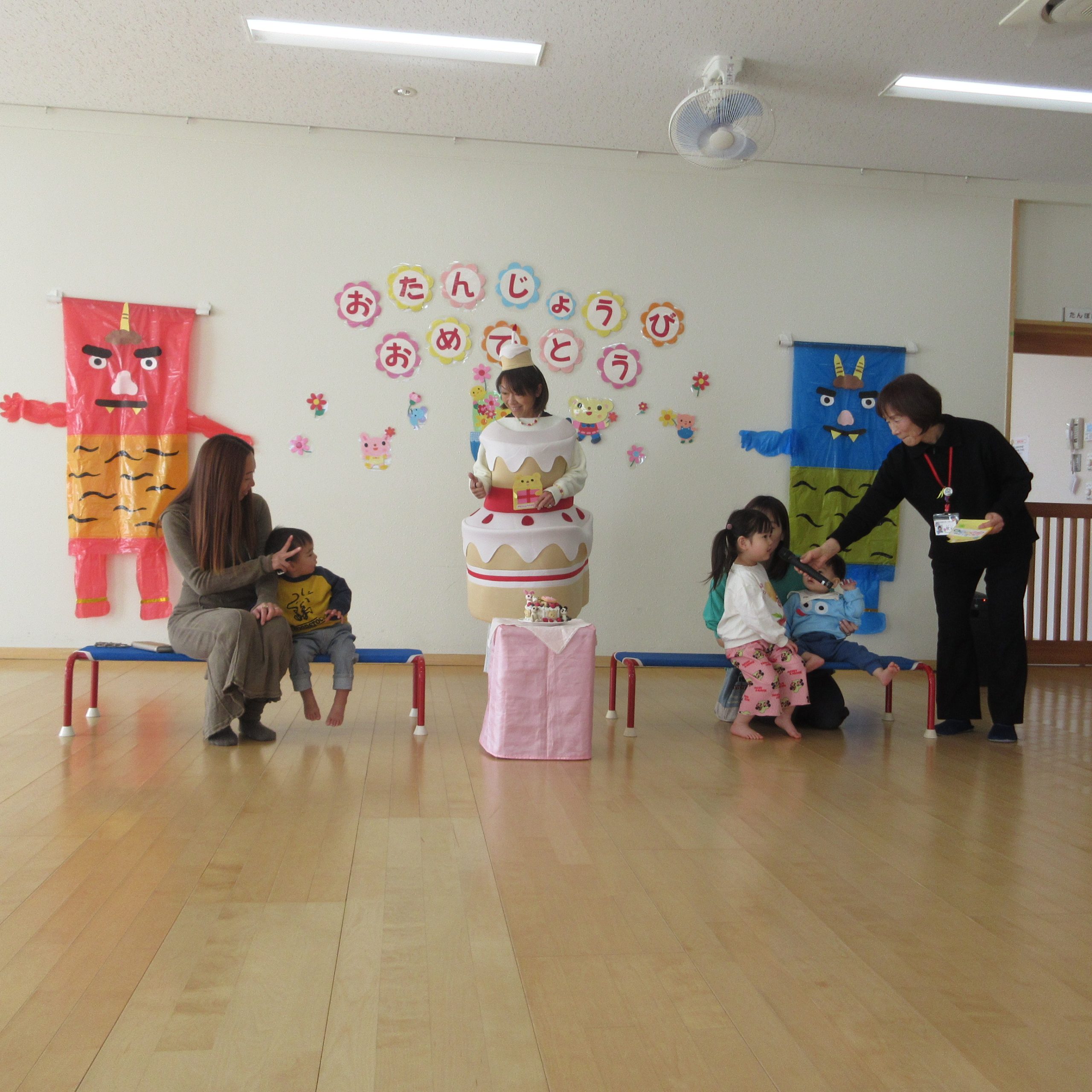 {2月生まれのお誕生会}では、1歳と2歳のお子さんをケーキちゃんからのバースディカードプレゼントとみんなからの歌でお祝いしました。