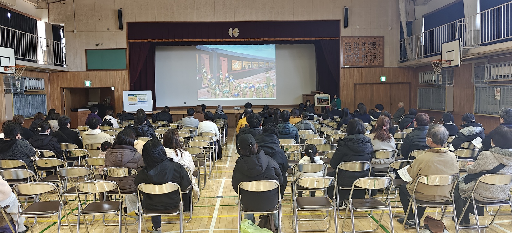 紙芝居での孫娘さくらちゃんとおじいさんの物語を通して、戦時下の「学童集団疎開」の体験や、語り部一人ひとりの実体験が語られ、戦争の悲惨さだけでなく、先人の経験をどう受け止め、今をどう生きるかを考える機会として、戦後80年、貴重な証言を未来を担う子どもたちへ伝える場となりました。